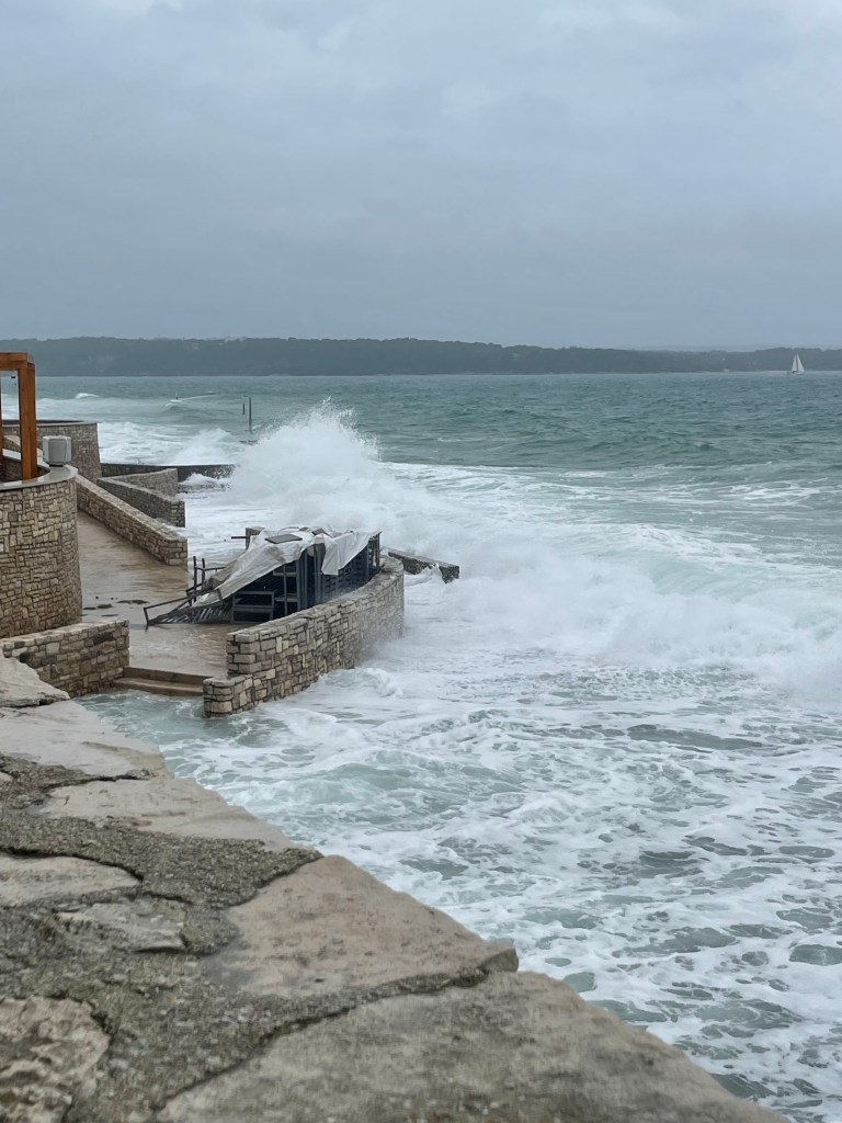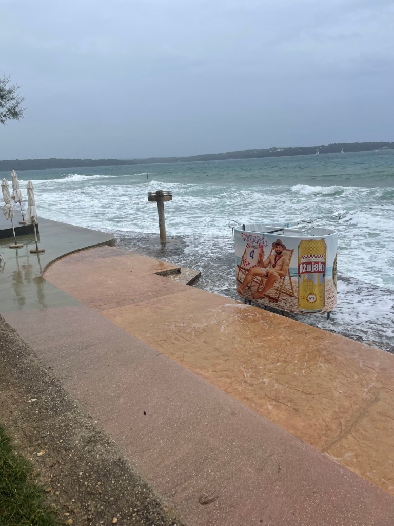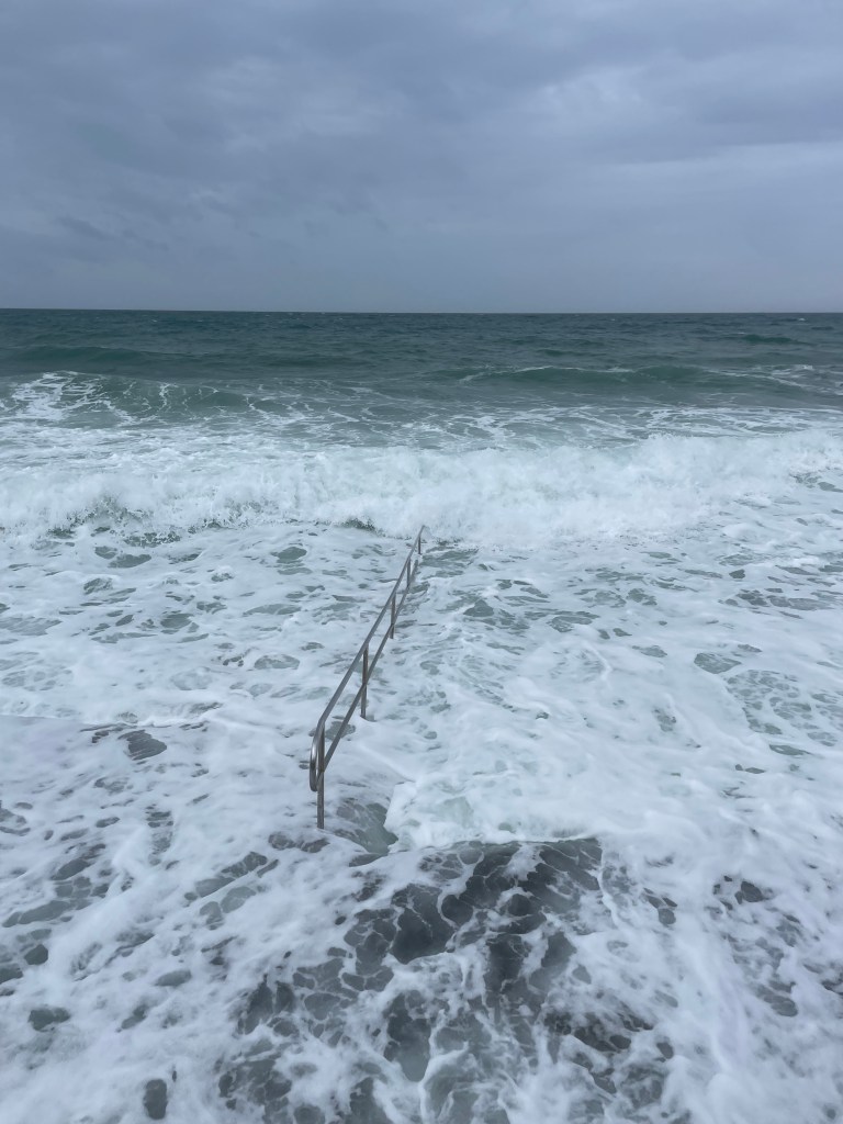 With our gortex jackets on we headed off to the seafront. What a difference from yesterday’s millpond conditions, today waves were splashing up and over the waterside path. The change and shower stations were both getting inundated. Waves were even spraying up into some of the seaside restaurant outside terraces. At one spot water was rushing up stairways to the street.