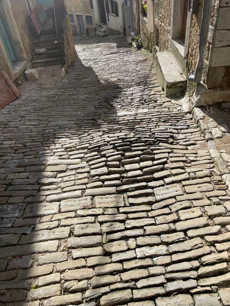 Nothing like starting the real walk with a nice downhill run on steep cobblestones to get the ankles and toes twitching- but at least we could see the township way off in the distance.