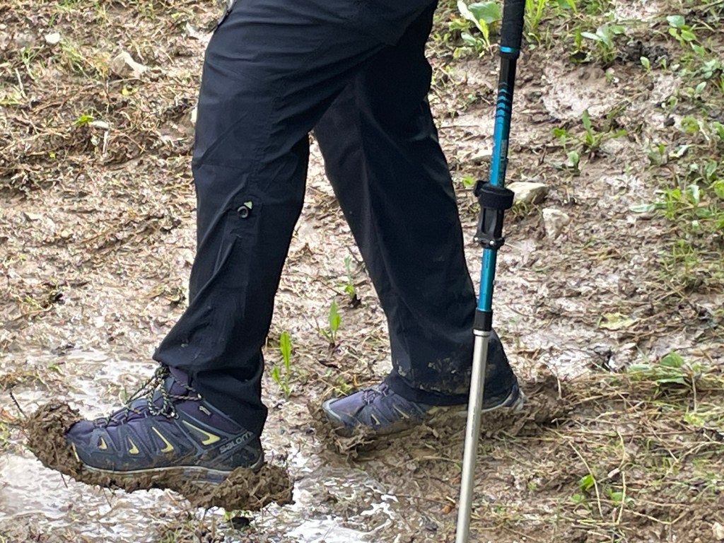 A great call it wasnt, as we wandered through tracks with landslips, walked away from home on many occasions and still ended up in the mud. At one spot Jane’s boots were completed covered. The look on her face suggested a photo wasn’t a good choice.