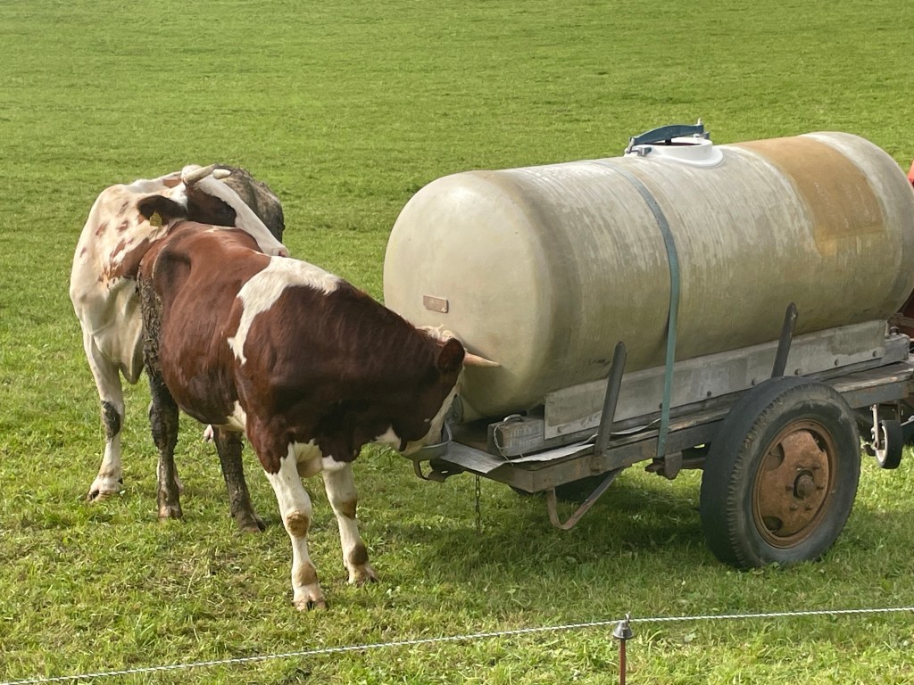 Getting the cows to drink must have been difficult on the hilly terrain, so farmer Gunther solved the problem by bringing the water to the animals. Two cows had a bit of a push and shove so they could have a slurp.