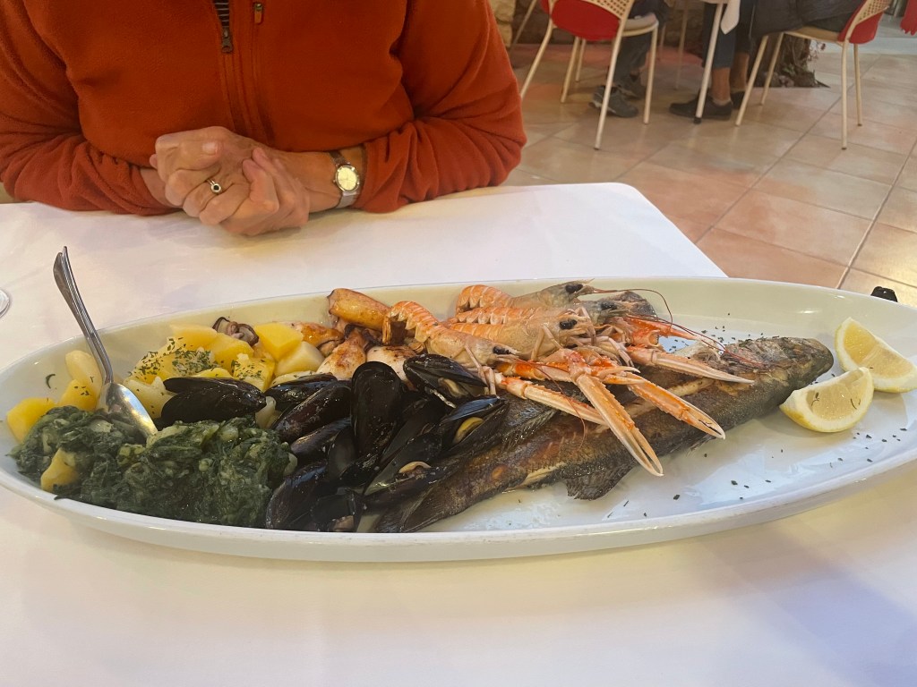 After an hour or so of people watching and drinking in the surroundings , including a show by a flock of swallows, we headed for a nearby fish restaurant and shared a seafood platter of 2 types of fish, mussels, calamari, scampi and some potatoes garnished with chard. Washed down with a wine for Jane and a local pale ale for me.